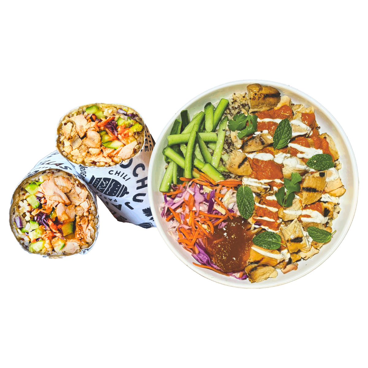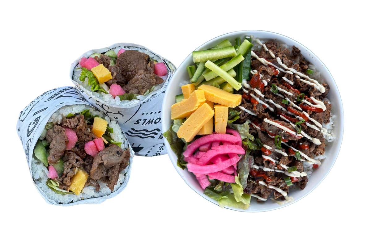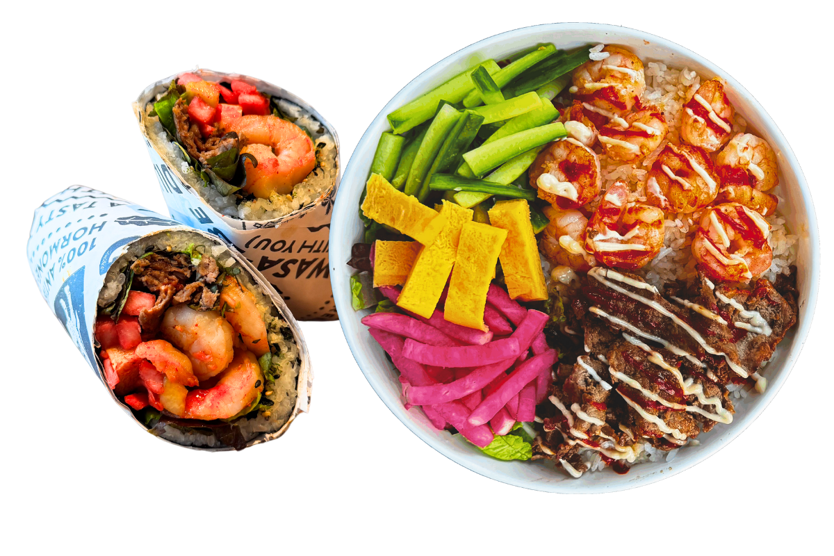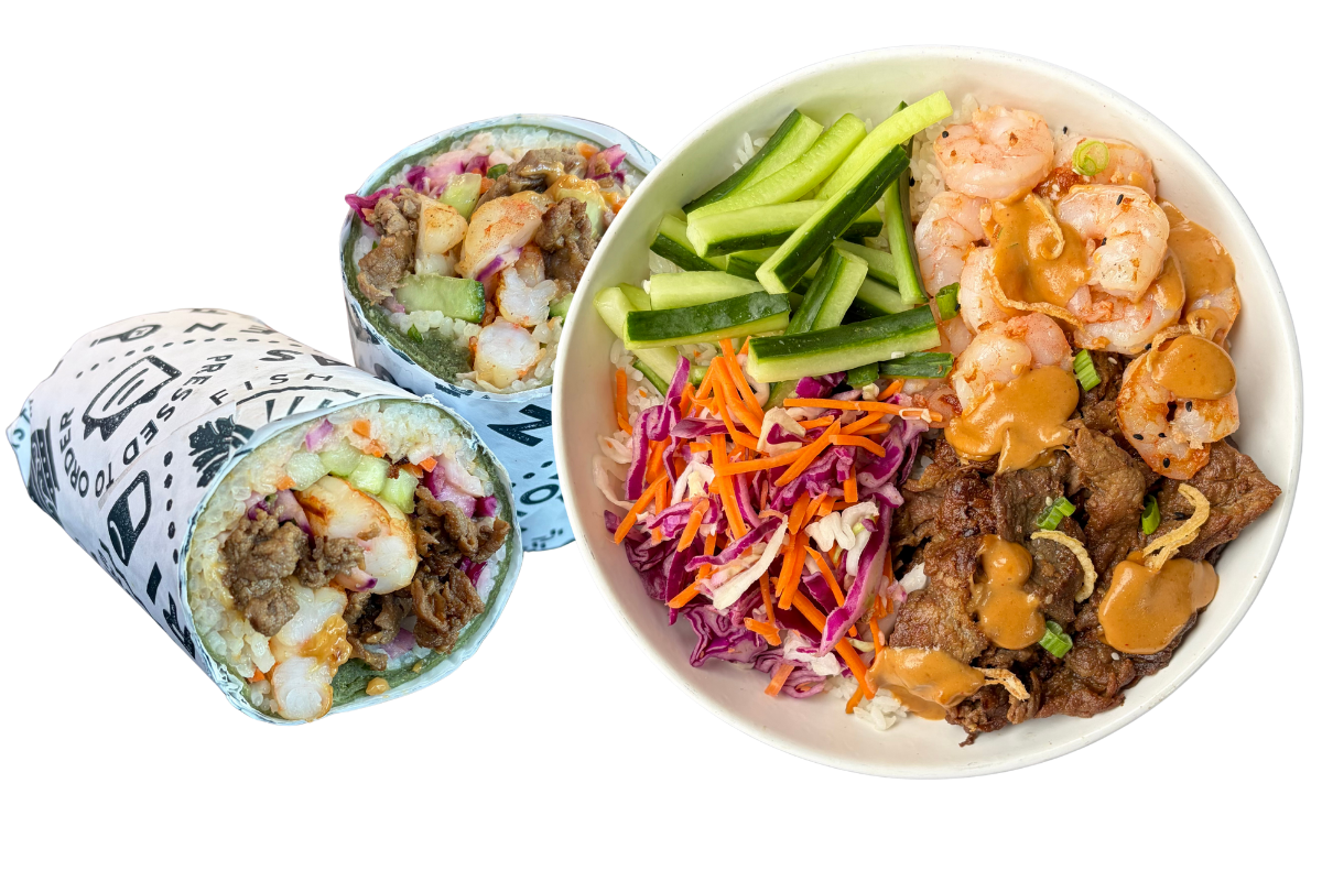 marinated steak, sautéed shrimp, sushi rice, red leaf lettuce, tamago, cucumber, organic pickled turnip, scallion, sesame-furikake seasoning, garlic aioli, gochujang sauce, nori wrapp