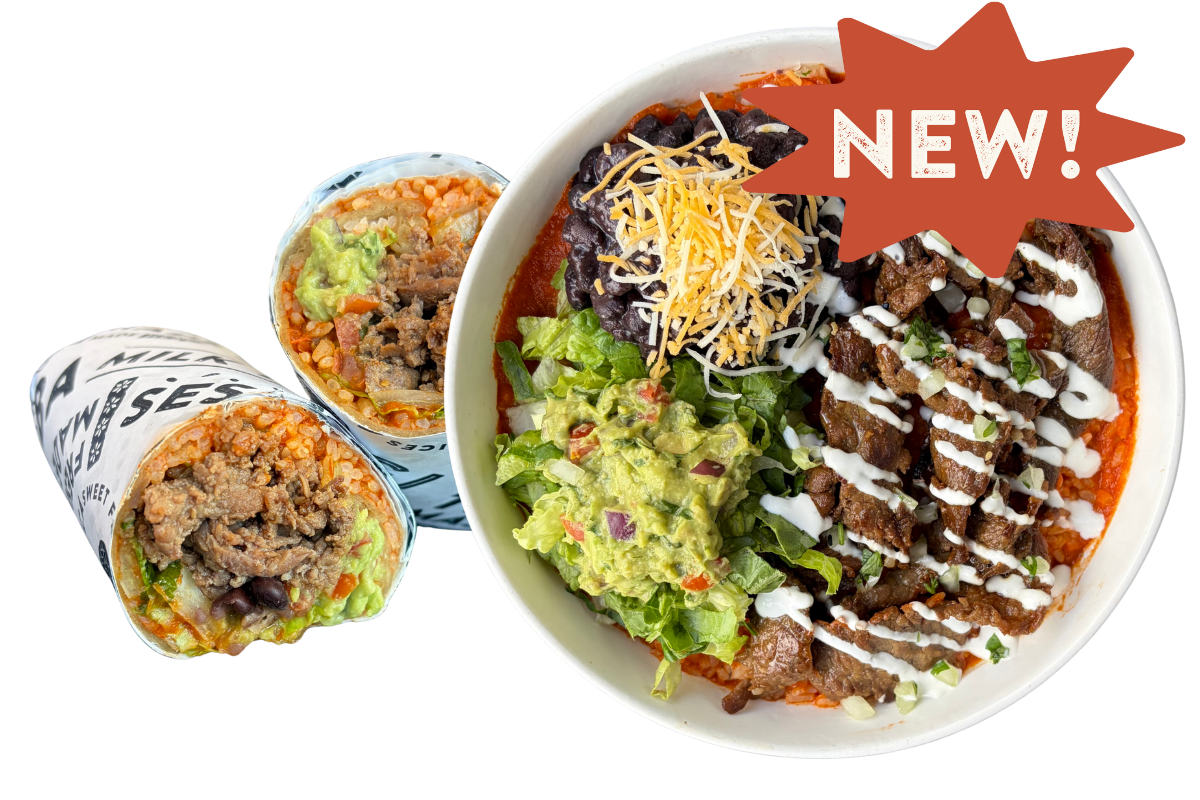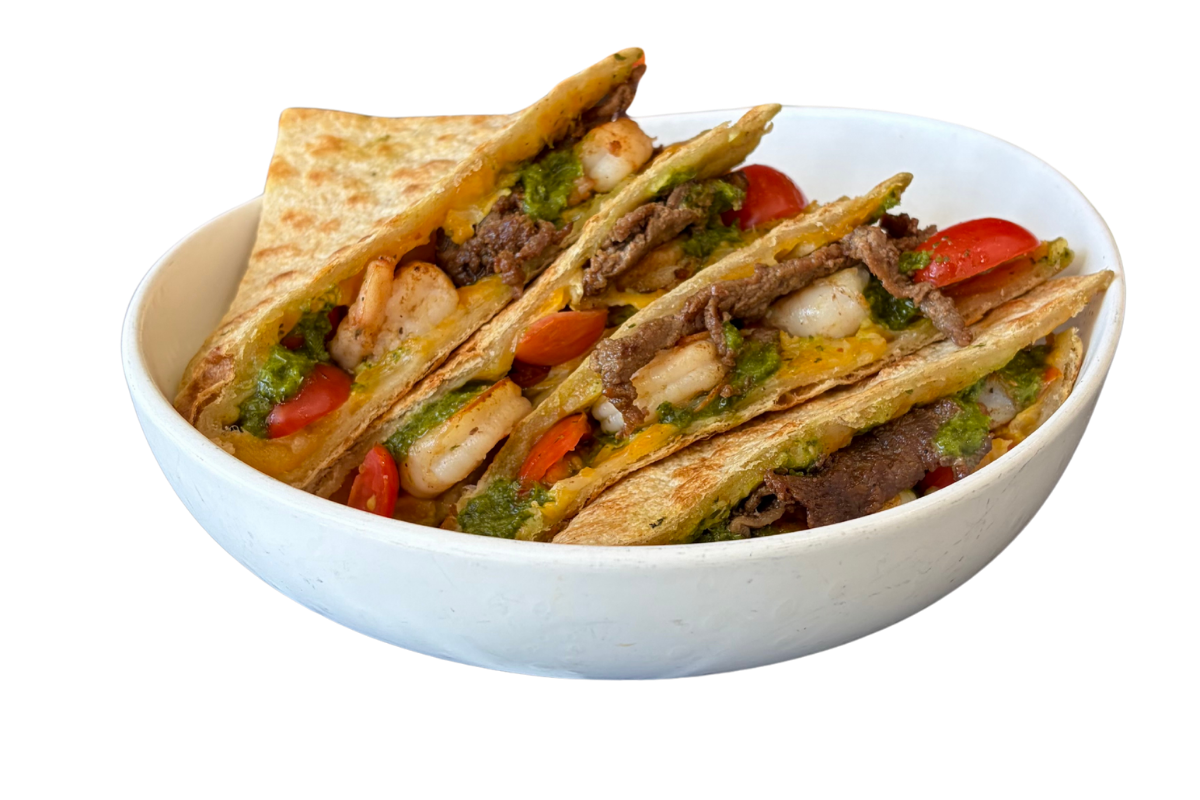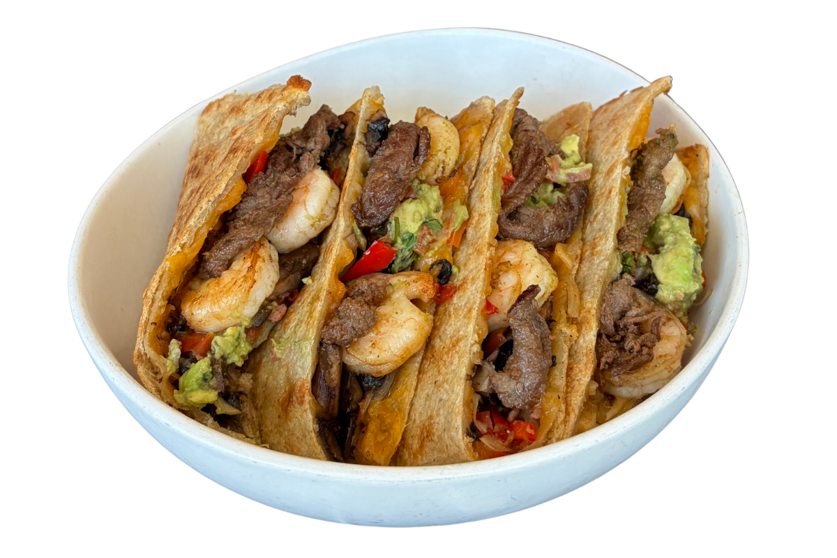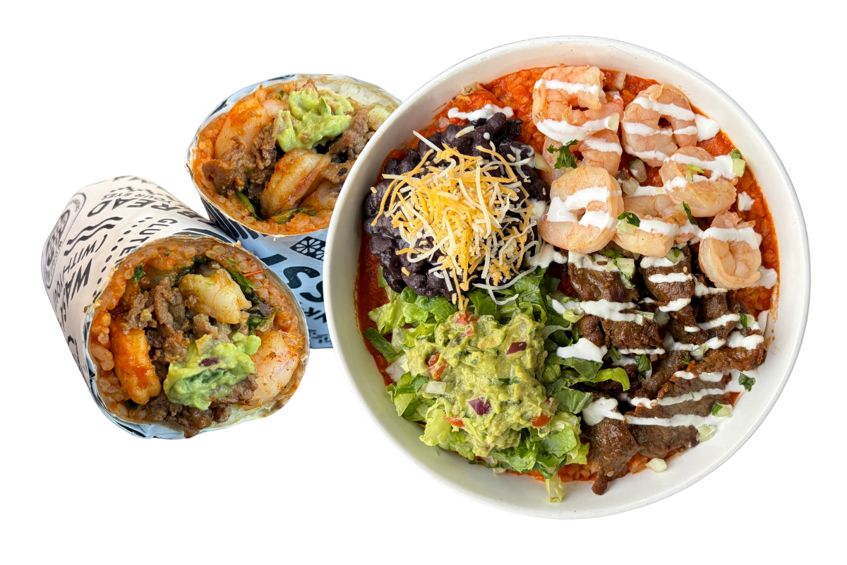 marinated steak, sautéed shrimp, spanish style rice, romaine, cheddar/jack, guacamole, black beans, white onion/cilantro, lime crema, bravas sauce, house flatbread