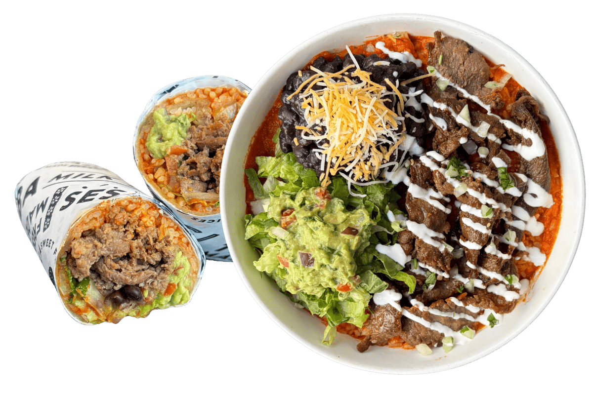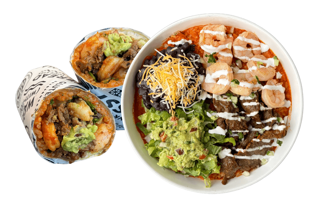 marinated steak, sautΓ©ed shrimp, spanish style rice, romaine, cheddar/jack, guacamole, black beans, white onion/cilantro, lime crema, bravas sauce, house flatbread