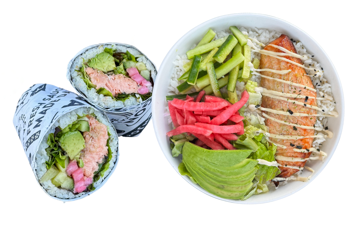 roasted salmon, sushi rice, red leaf lettuce, avocado, cucumber, organic pickled turnip, sesame-furikake seasoning, sesame-soy vinaigrette, garlic aioli, nori wrapp