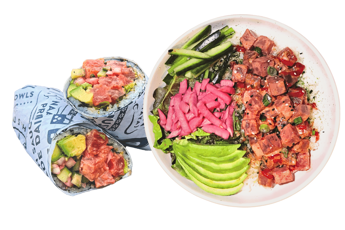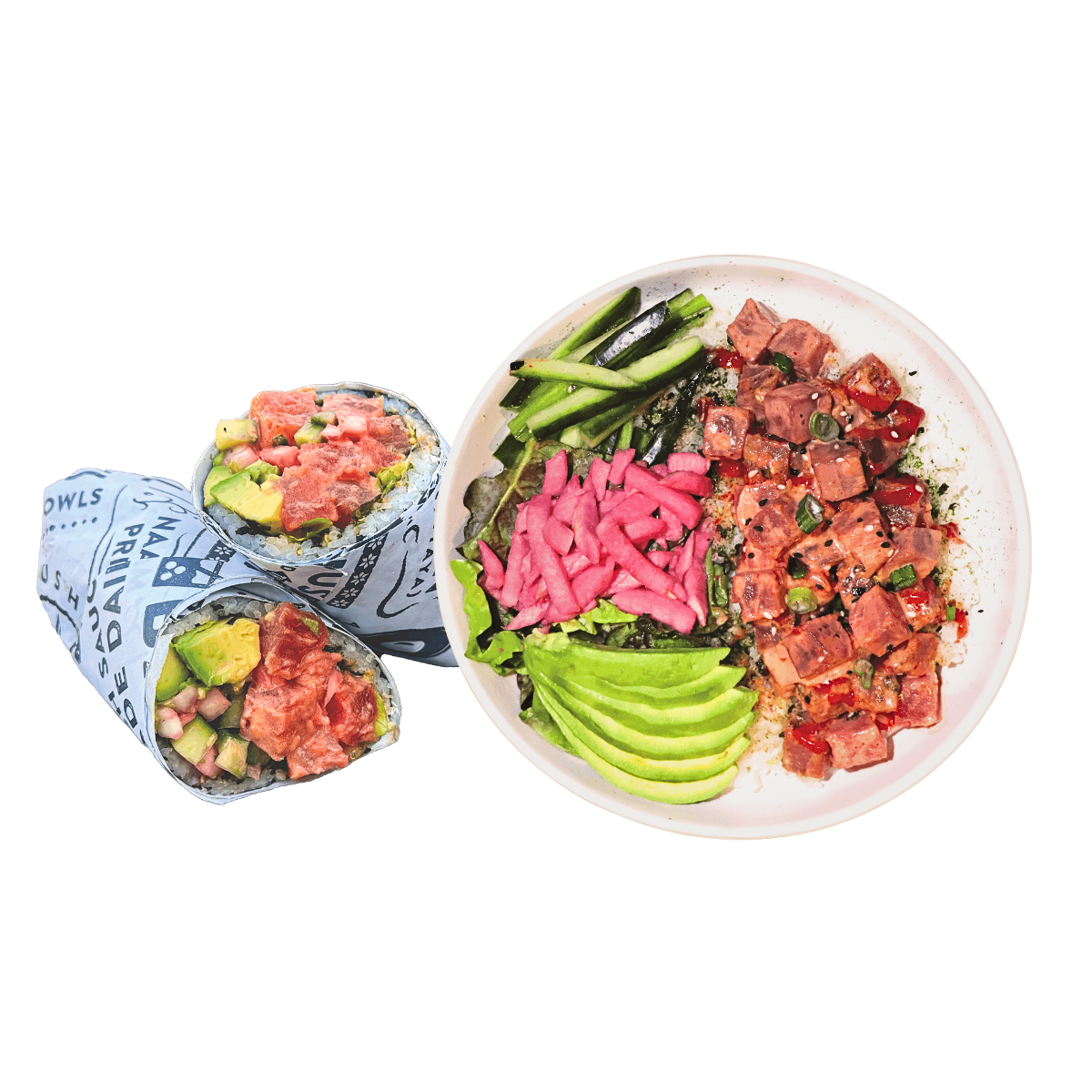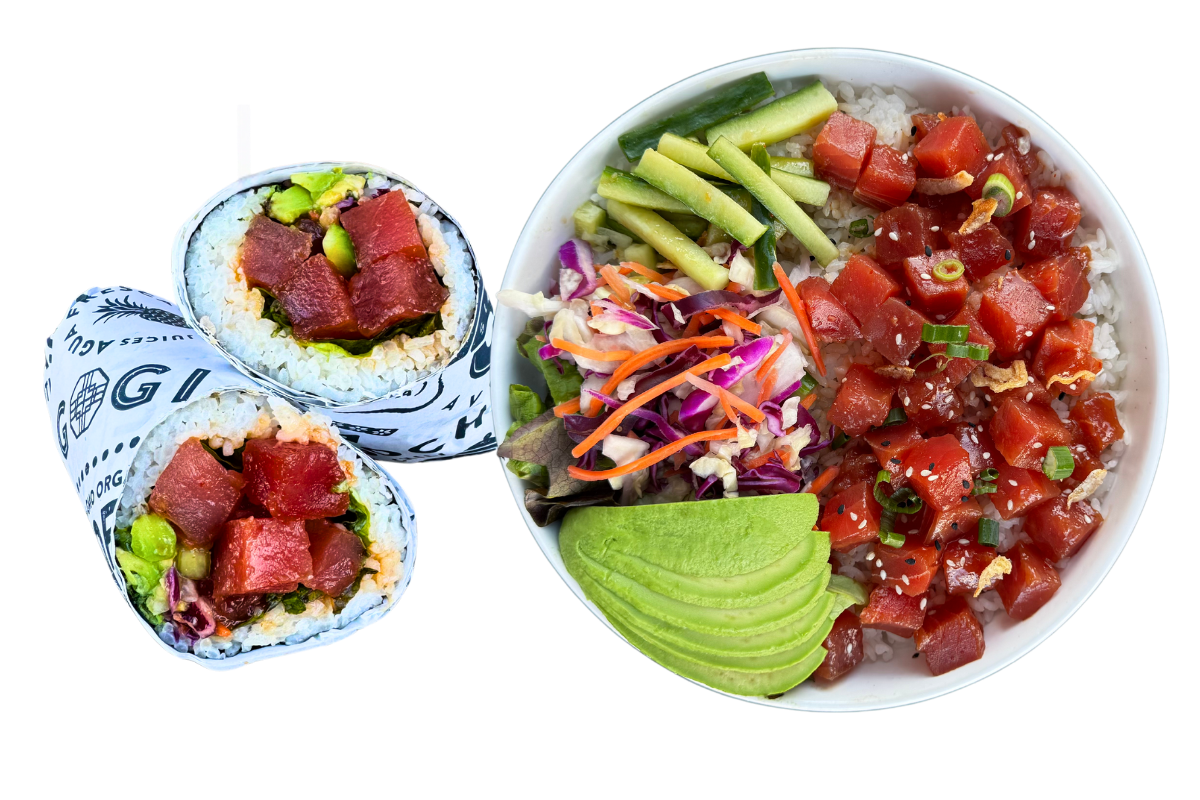 yellowfin tuna*, sushi rice, red leaf lettuce, avocado, cucumber, organic pickled turnip, scallion, sesame-furikake seasoning, sriracha, wasabi vinaigrette, sriracha aioli, nori wrapp