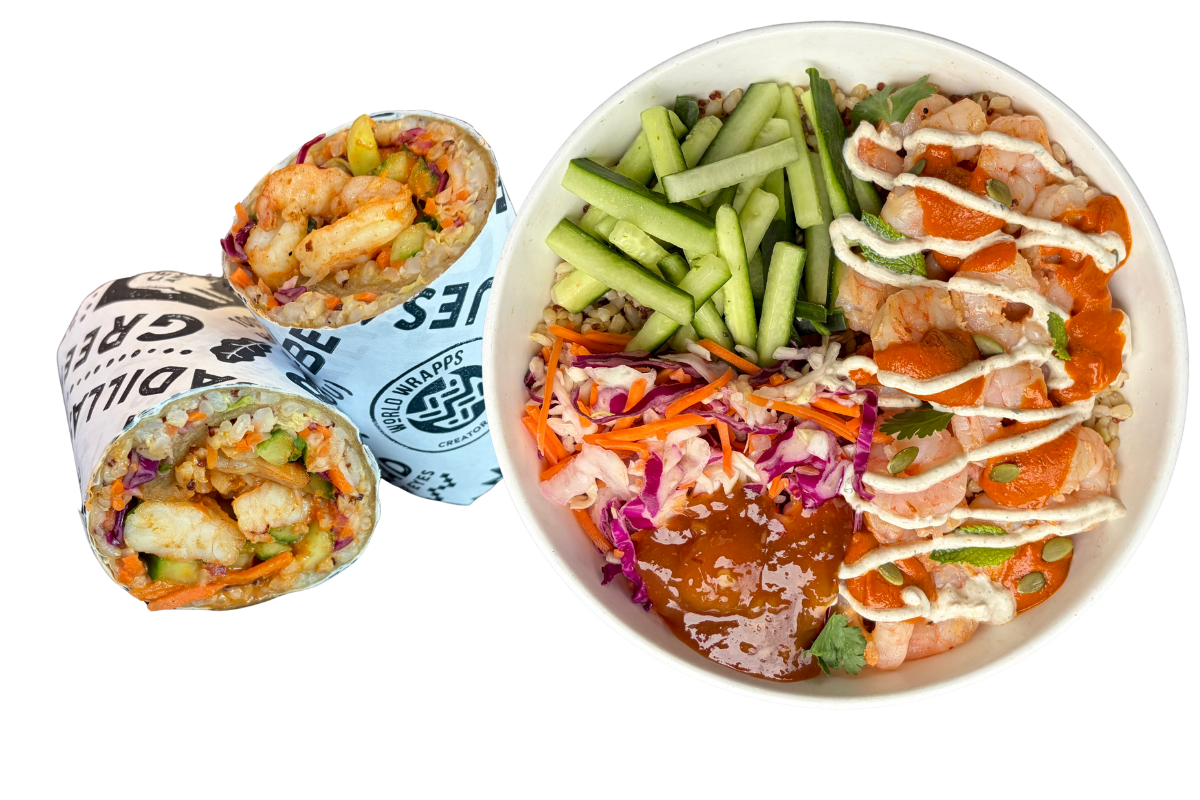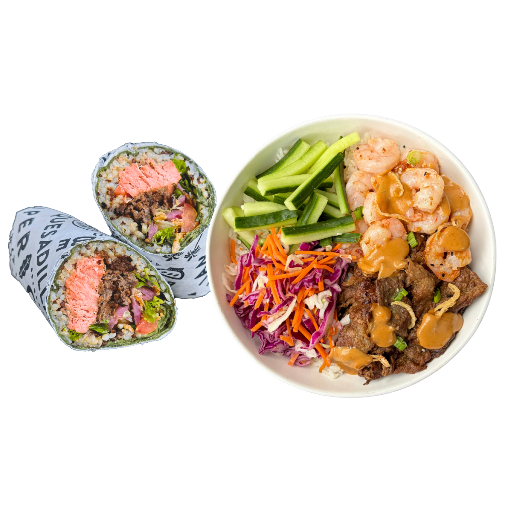marinated steak, sautéed shrimp, sushi rice, cucumber, rainbow slaw, scallion, crispy shallot, sesame seeds, peanut sauce, supergreen flatbread