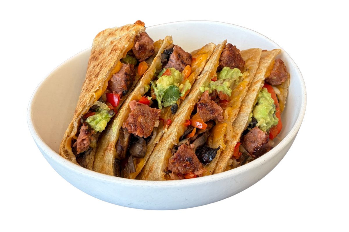 beyond meat, sautéed onion/red pepper/mushroom, guacamole, bravas sauce