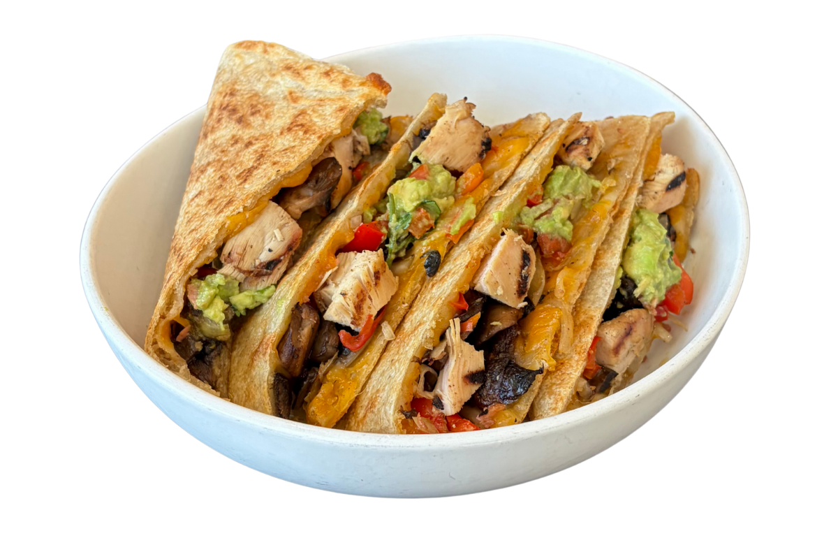 sautéed onion/red pepper/mushroom, guacamole, bravas sauce