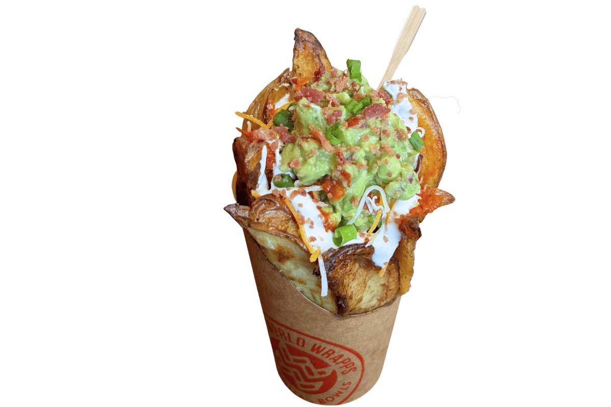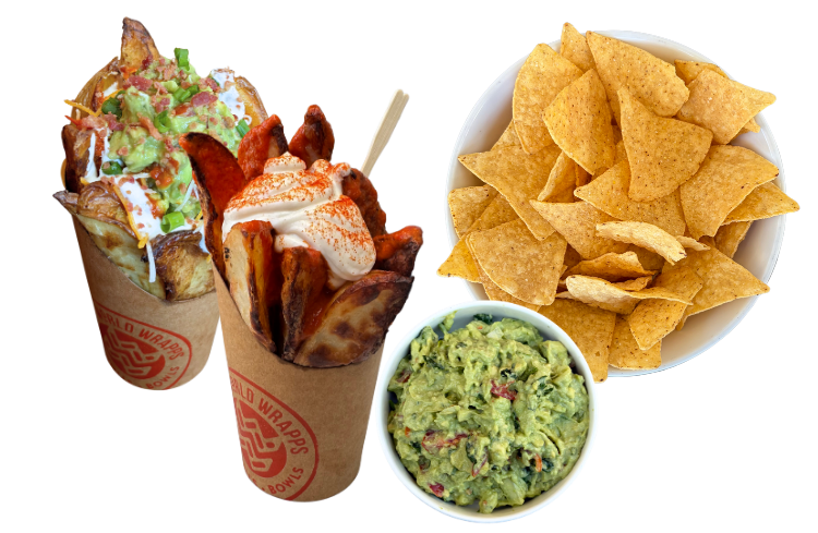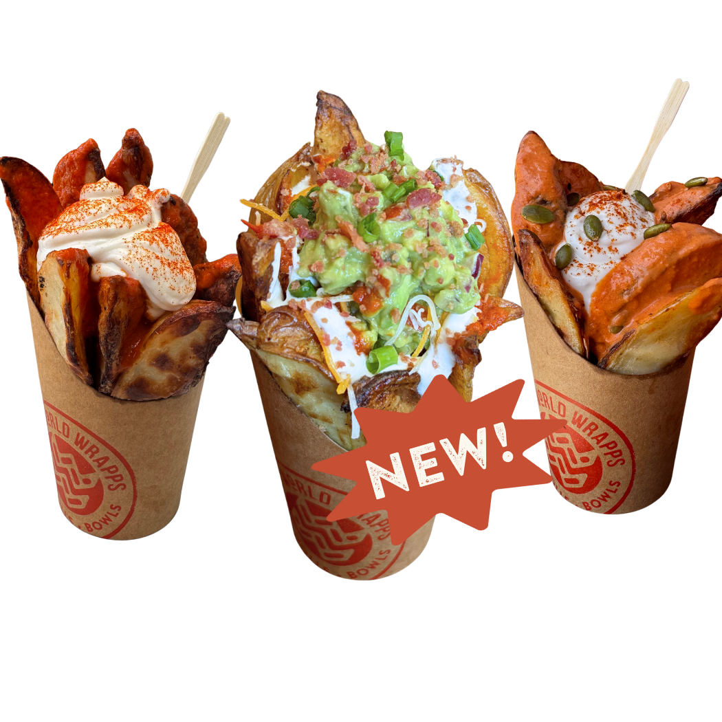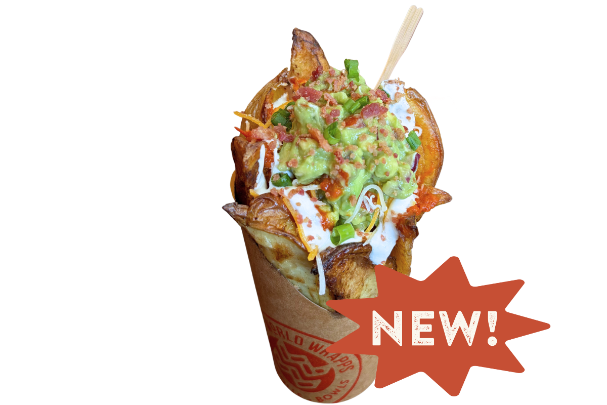 freshly cut and baked potatoes, bacon bits, cheddar/jack, scallions, guacamole, lime crema