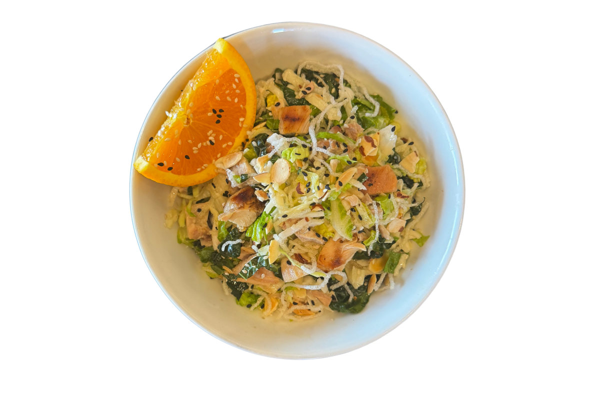 romaine lettuce/kale/green cabbage mix, crispy rice noodles, toasted almonds, sesame seeds, orange slice,