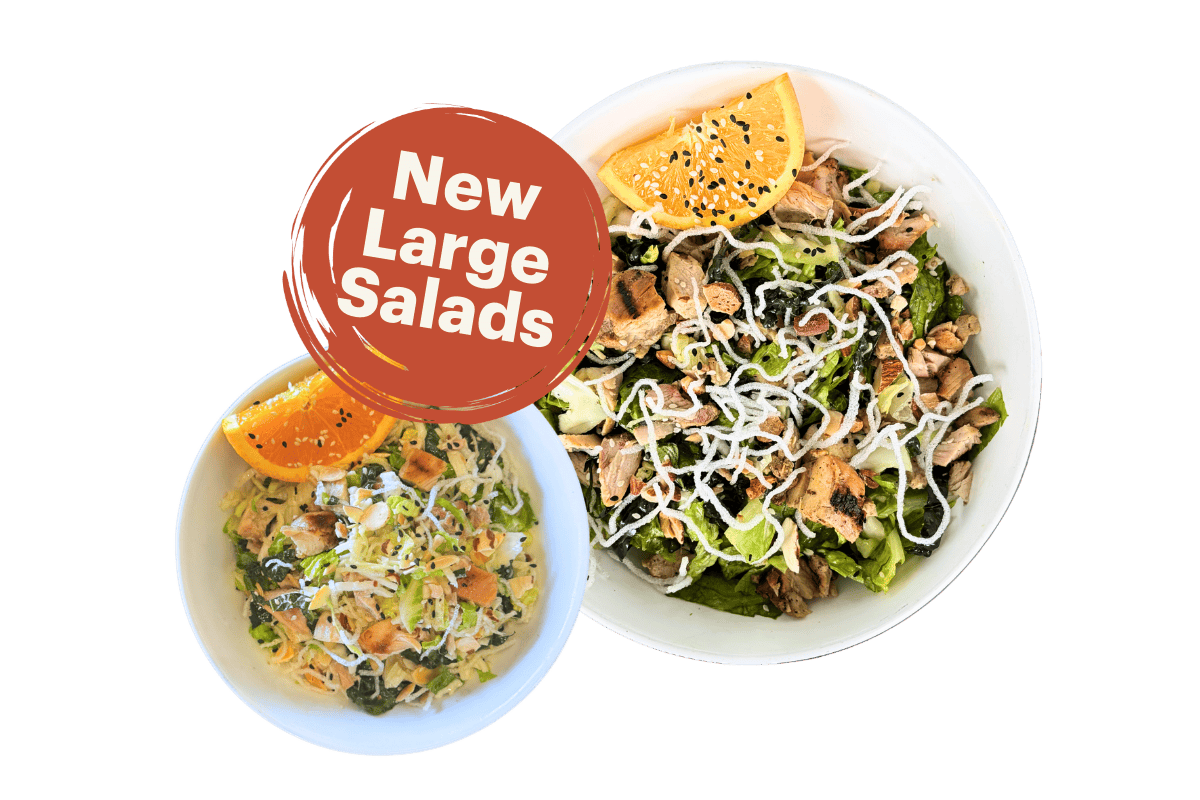 romaine lettuce/kale/green cabbage mix, crispy rice noodles, toasted almonds, sesame seeds, orange slice, asian dressing