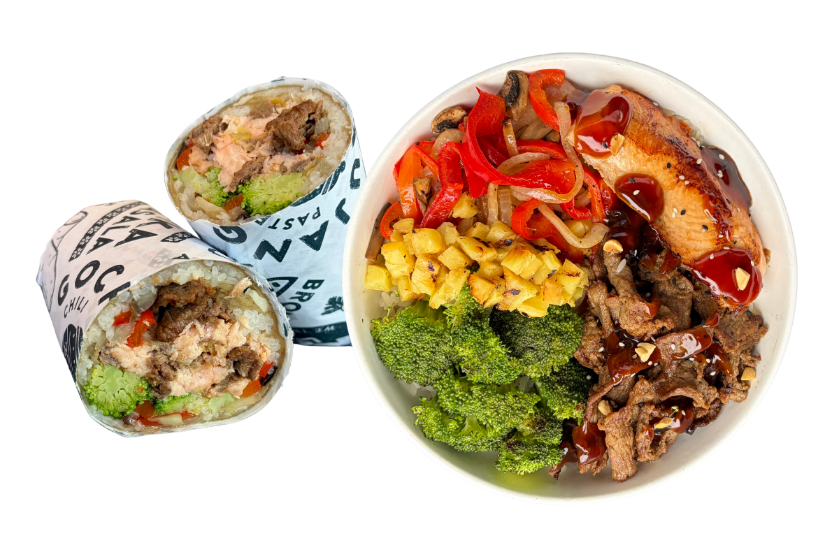 sushi rice, broccoli, teriyaki sauce, house wrapp