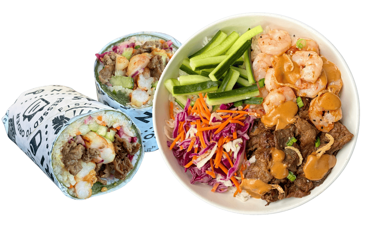 marinated steak, sautΓ©ed shrimp, sushi rice, red leaf lettuce, tamago, cucumber, organic pickled turnip, scallion, sesame-furikake seasoning, garlic aioli, gochujang sauce, nori wrapp