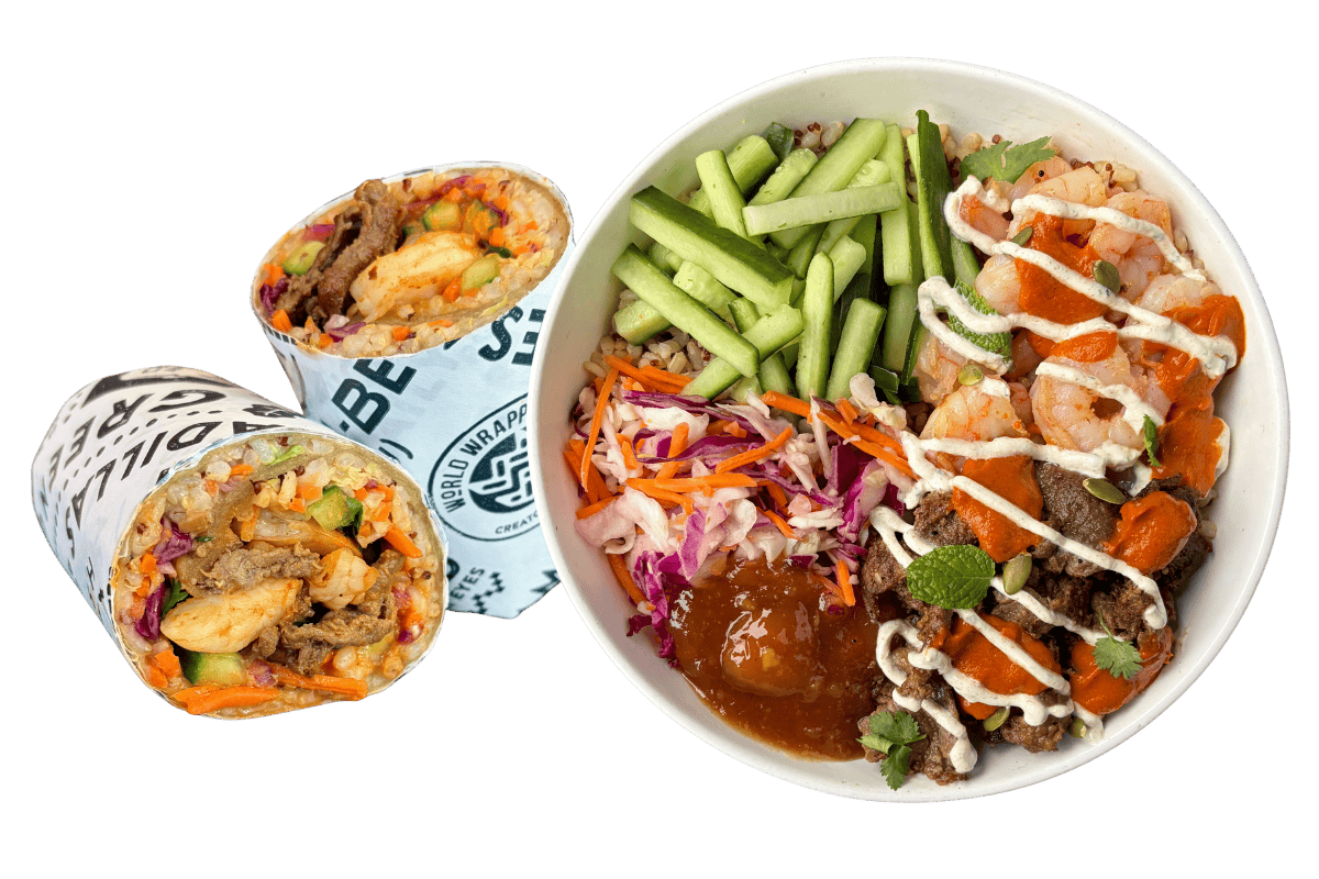 marinated steak, sautΓ©ed shrimp, sushi rice, cucumber, rainbow slaw, scallion, crispy shallot, sesame seeds, peanut sauce, supergreen flatbread